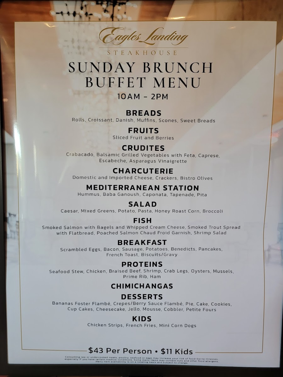 Desserts feature selections like creme brulee, cheesecake slices, bread pudding, and chocolate brownies, rounding out the meal with classic sweets.