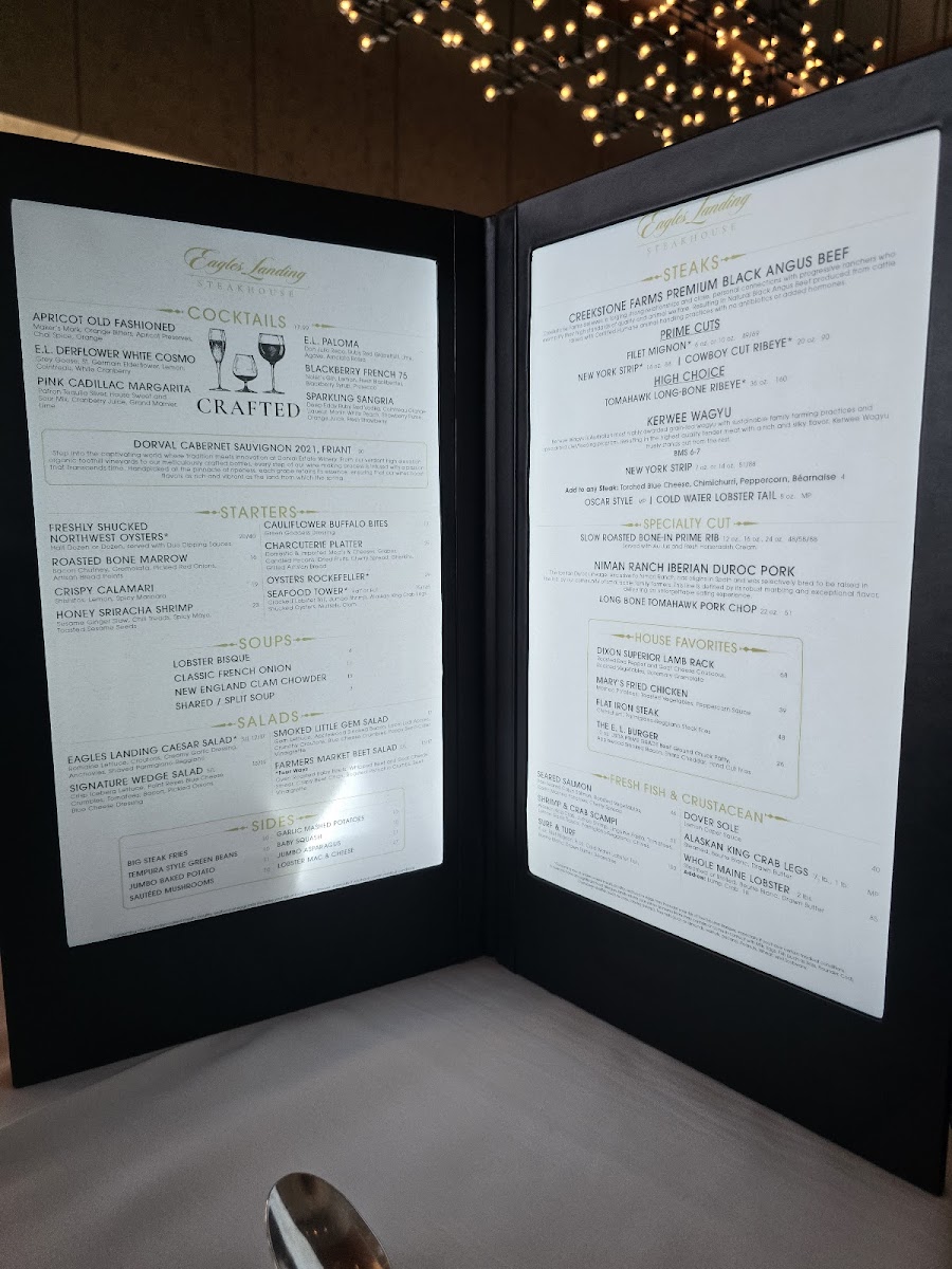 The menu at Eagles Landing Steakhouse features a variety of options centered around classic steakhouse fare alongside seafood and complementary sides. It is organized into distinct sections for easy browsing, including cocktails, starters, salads, main entrees, and desserts.
